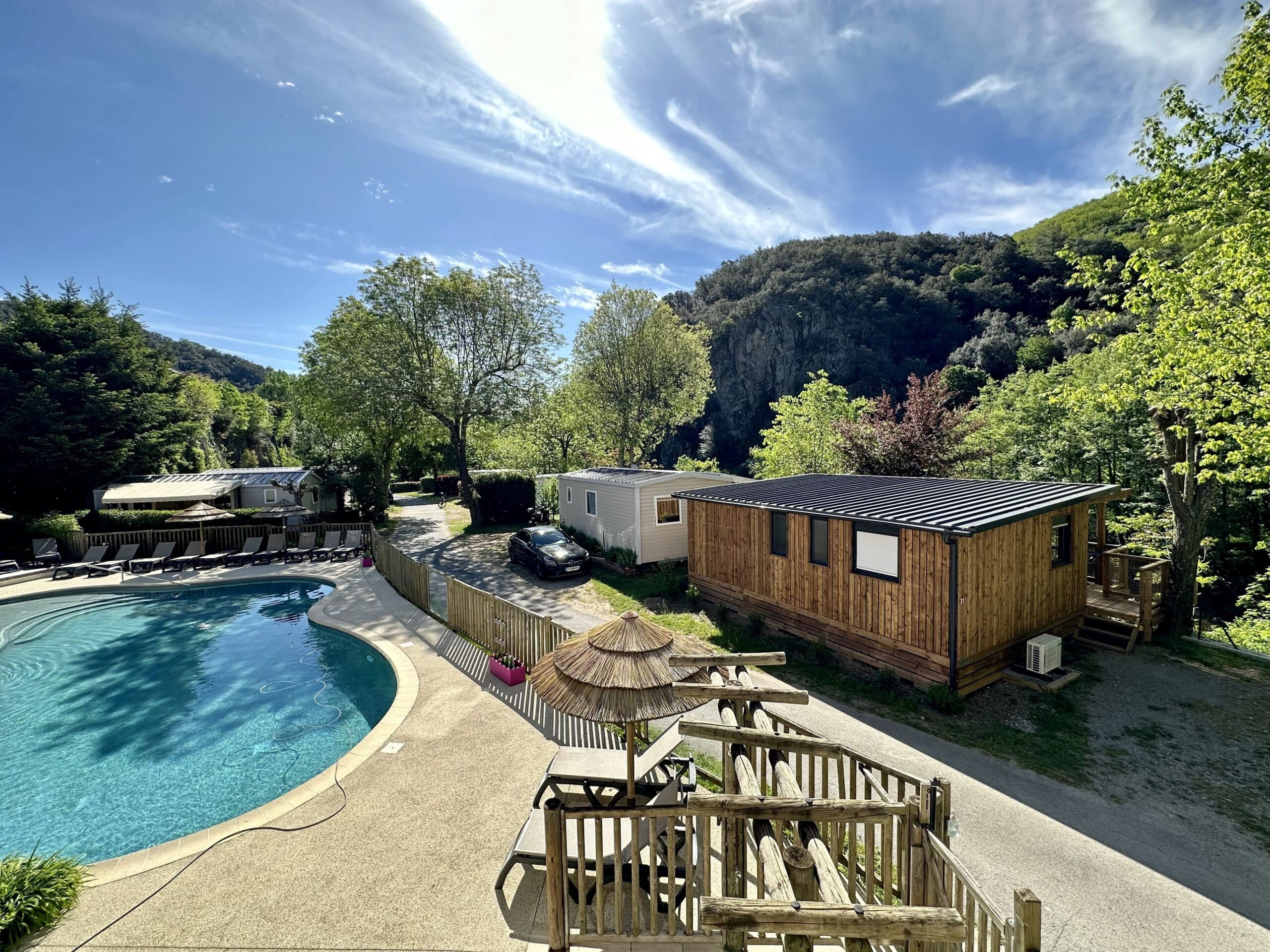 Le Domaine de la Plage, à Meyras en Ardèche, propose divers hébergements pour répondre aux envies de chaque vacancier. Que ce soit en mobil-home climatisé, en chalet tout équipé ou en gîte de charme, chaque logement offre un espace confortable avec cuisine équipée, salle de bain et terrasse extérieure pour profiter des soirées estivales.